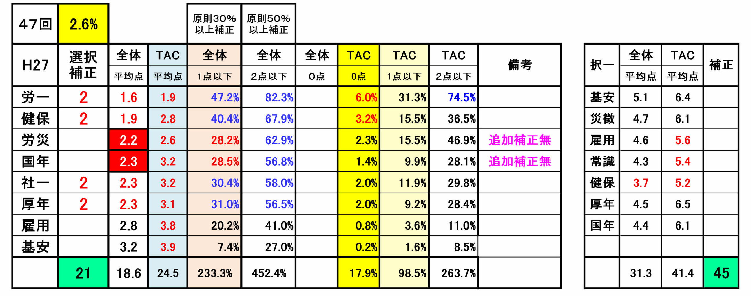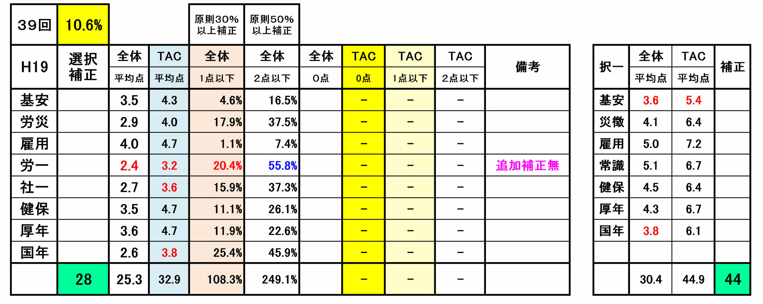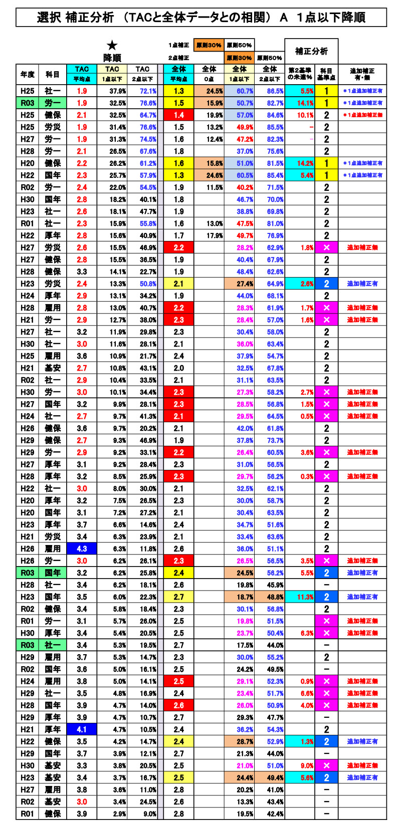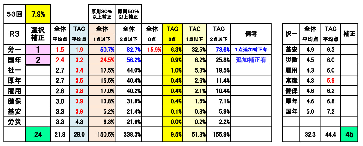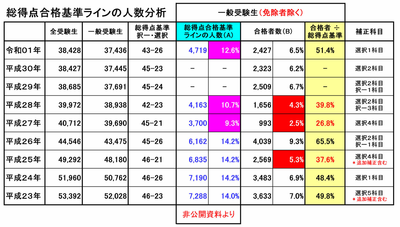 尚、前年第53回の選択式科目補正(例外補正=追加補正)は、過去の補正基準との整合性が著しく損なわれていました。合格という観点からみれば、今回は、受験生にとってはプラス傾向でしたが・・!