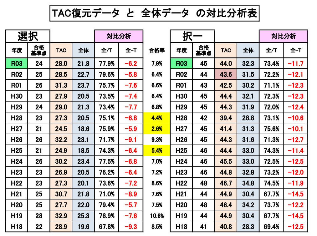 ⇒ よって、今後の資格学校などによる「復元データ」を元にした合格基準の予測精度は低下すると思います。(当たるも八卦 当たらぬも八卦)